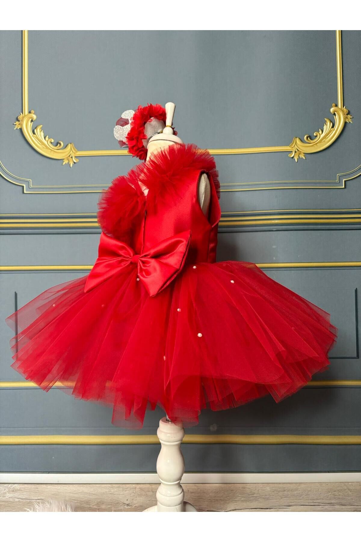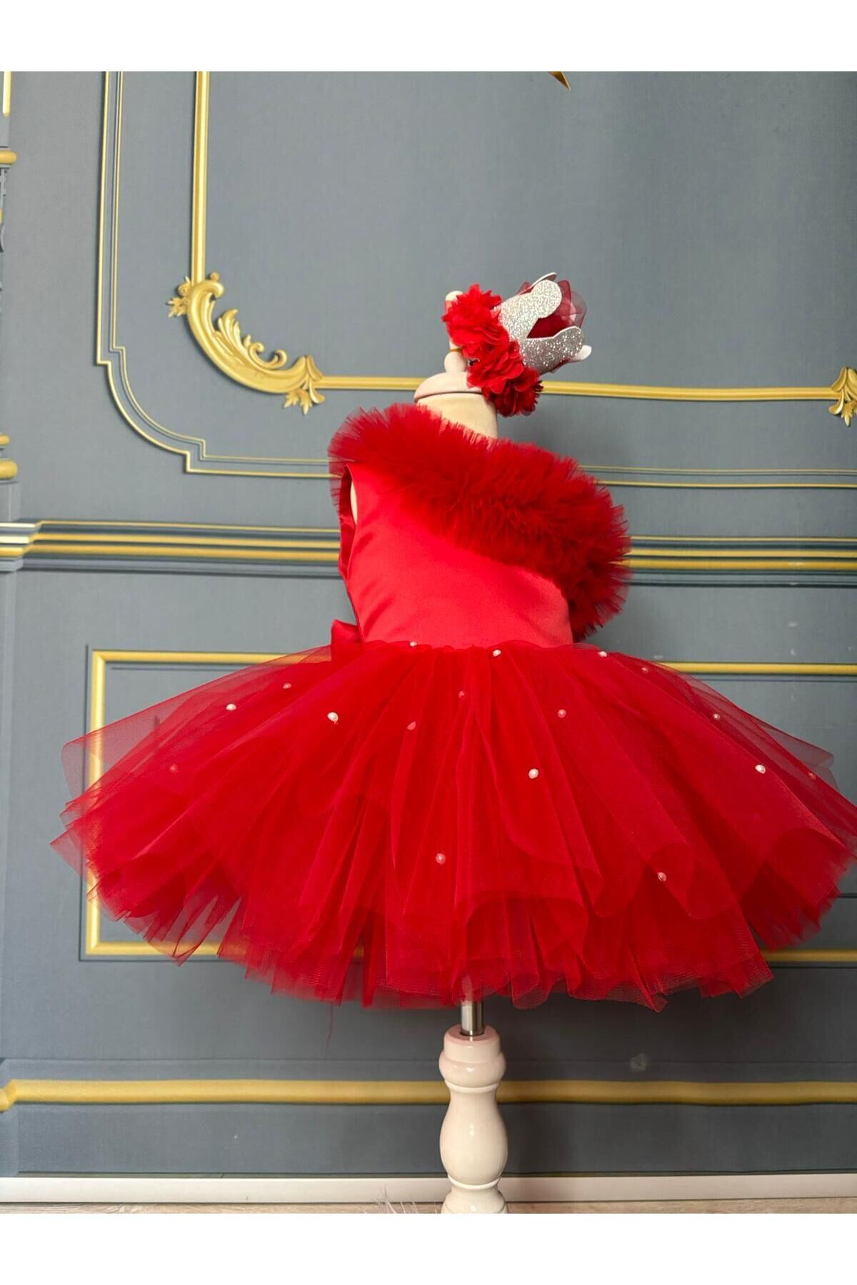 Kırmızı Kız Çocuk Tek Omuz Tütü Elbise, İnci Detaylı Kırmızı Elbise