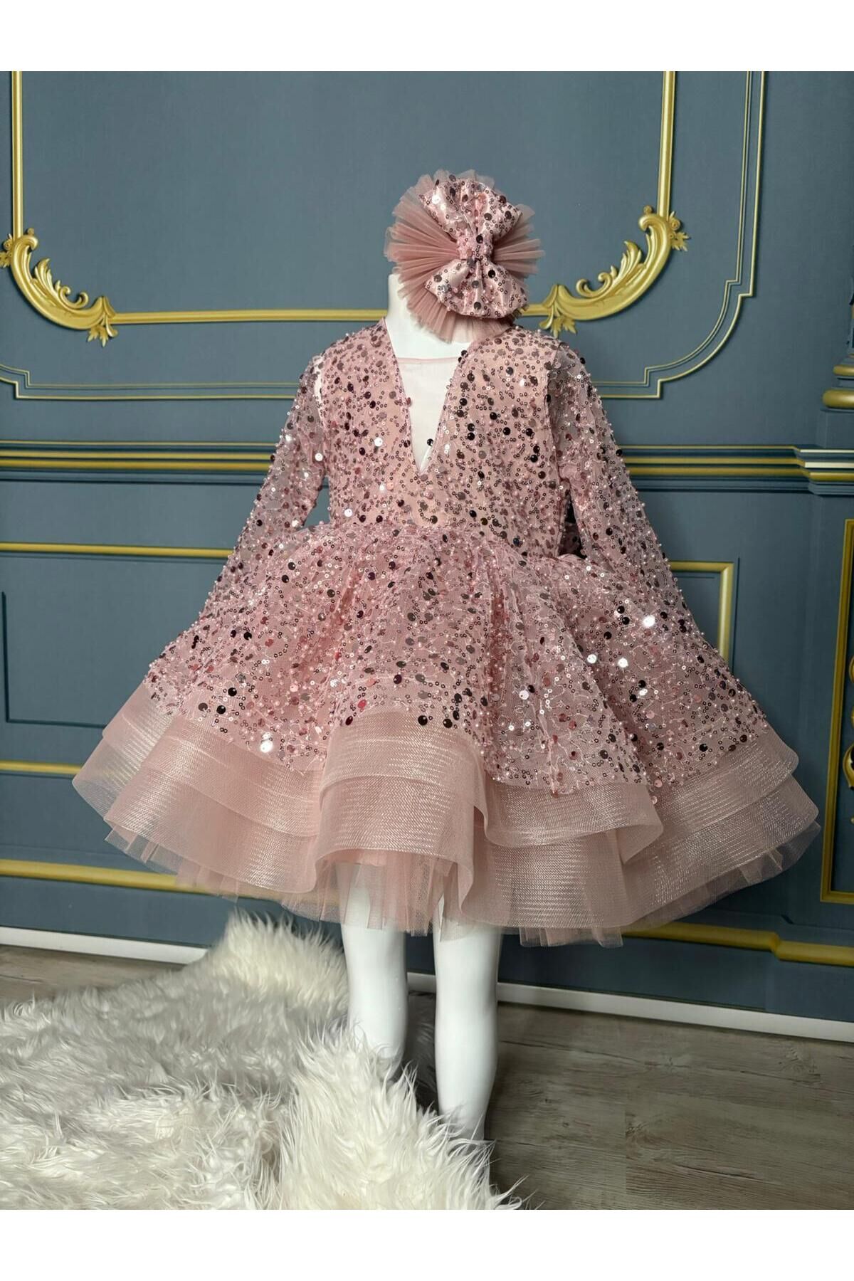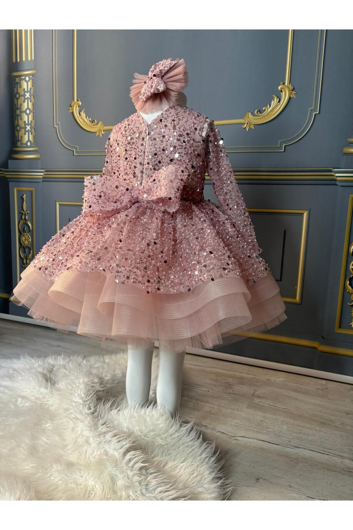Kız çocuklar için tasarlanan pudra pembe boncuklu elbise, zarafeti ve şıklığı bir arada sunar.; Yumuşak tül kumaşı ve özenle işlenmiş boncuk detaylarıyla özel günlerde parlayan bir görünüm sağlar.; Astarlı yapısı sayesinde cilt dostudur ve rahat bir kullanım sunar.; Doğum günü, düğün, bayram veya özel davetlerde minik prensesinizin göz kamaştırıcı görünmesini sağlar.