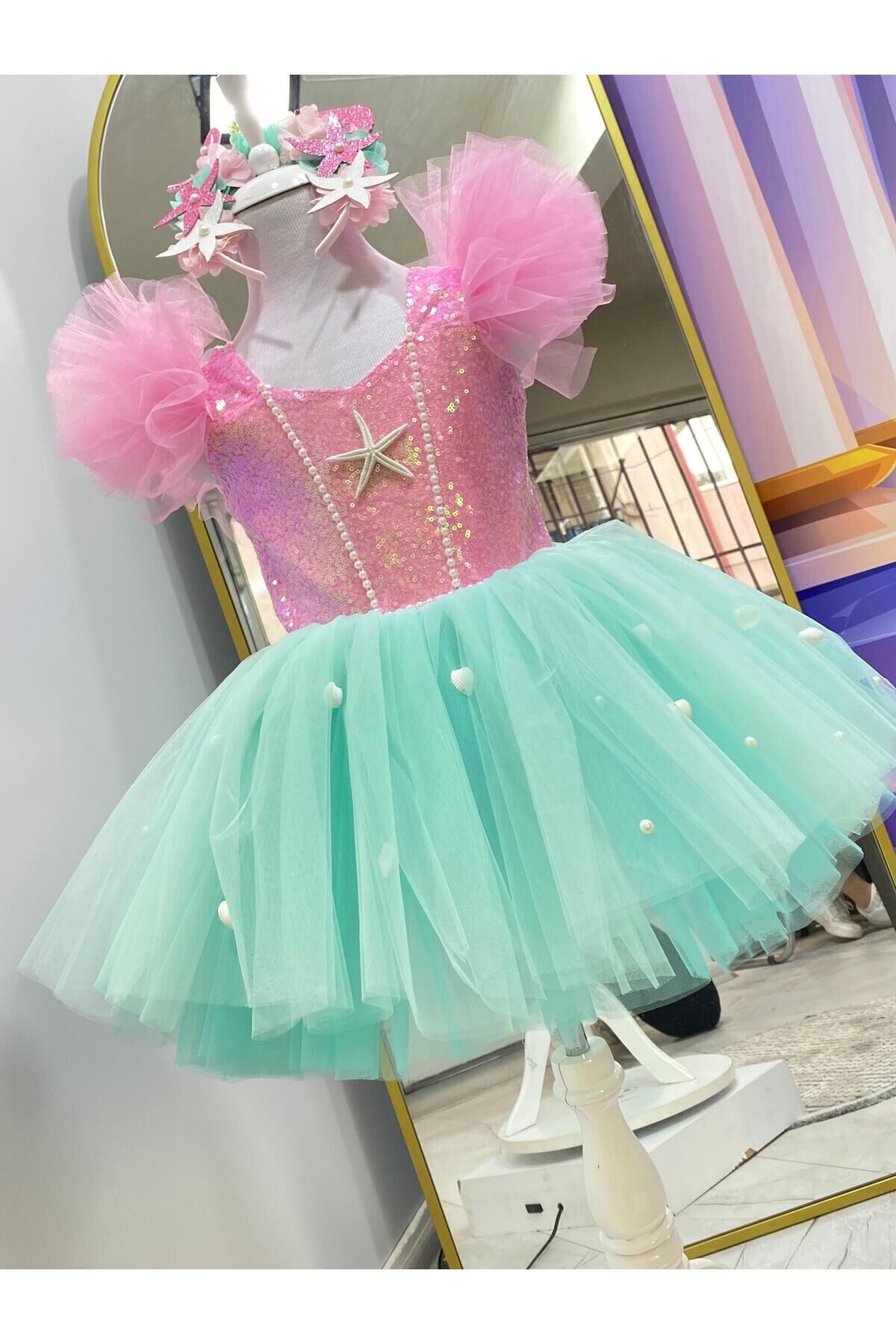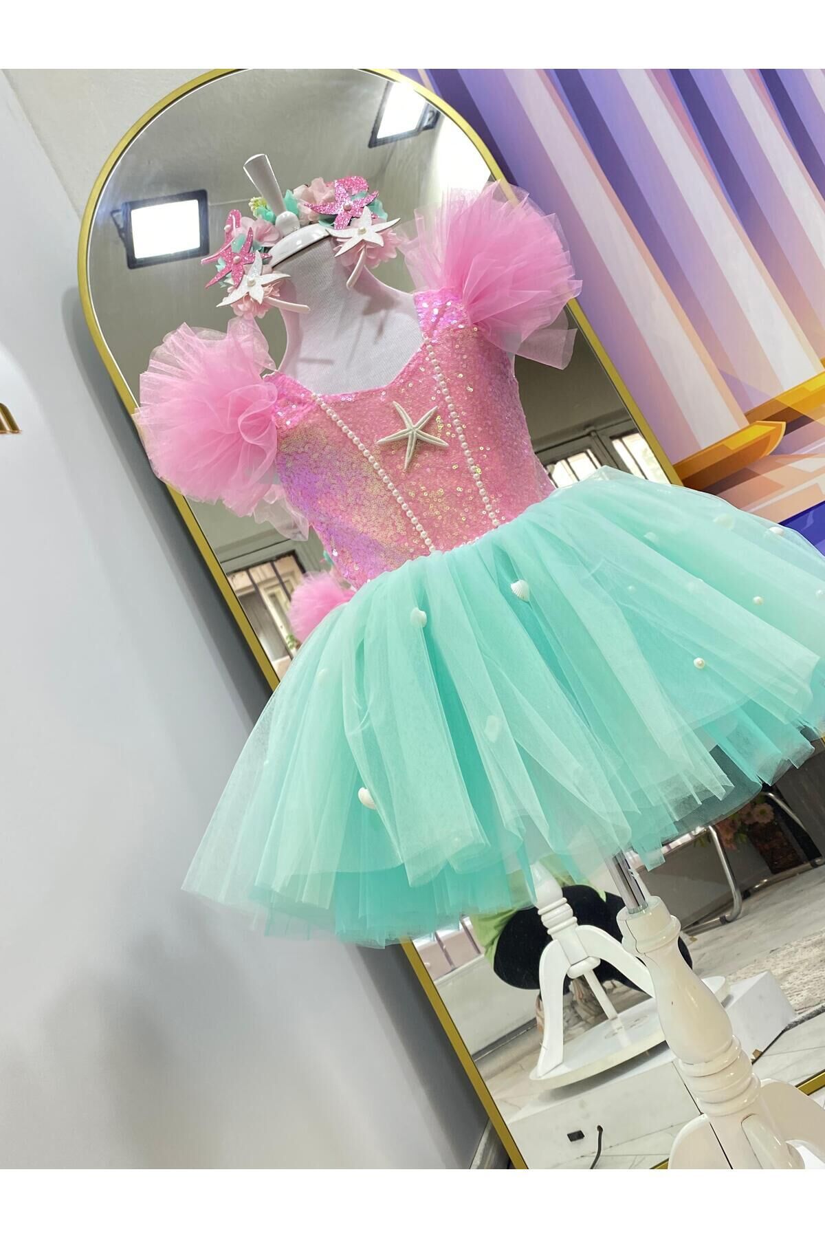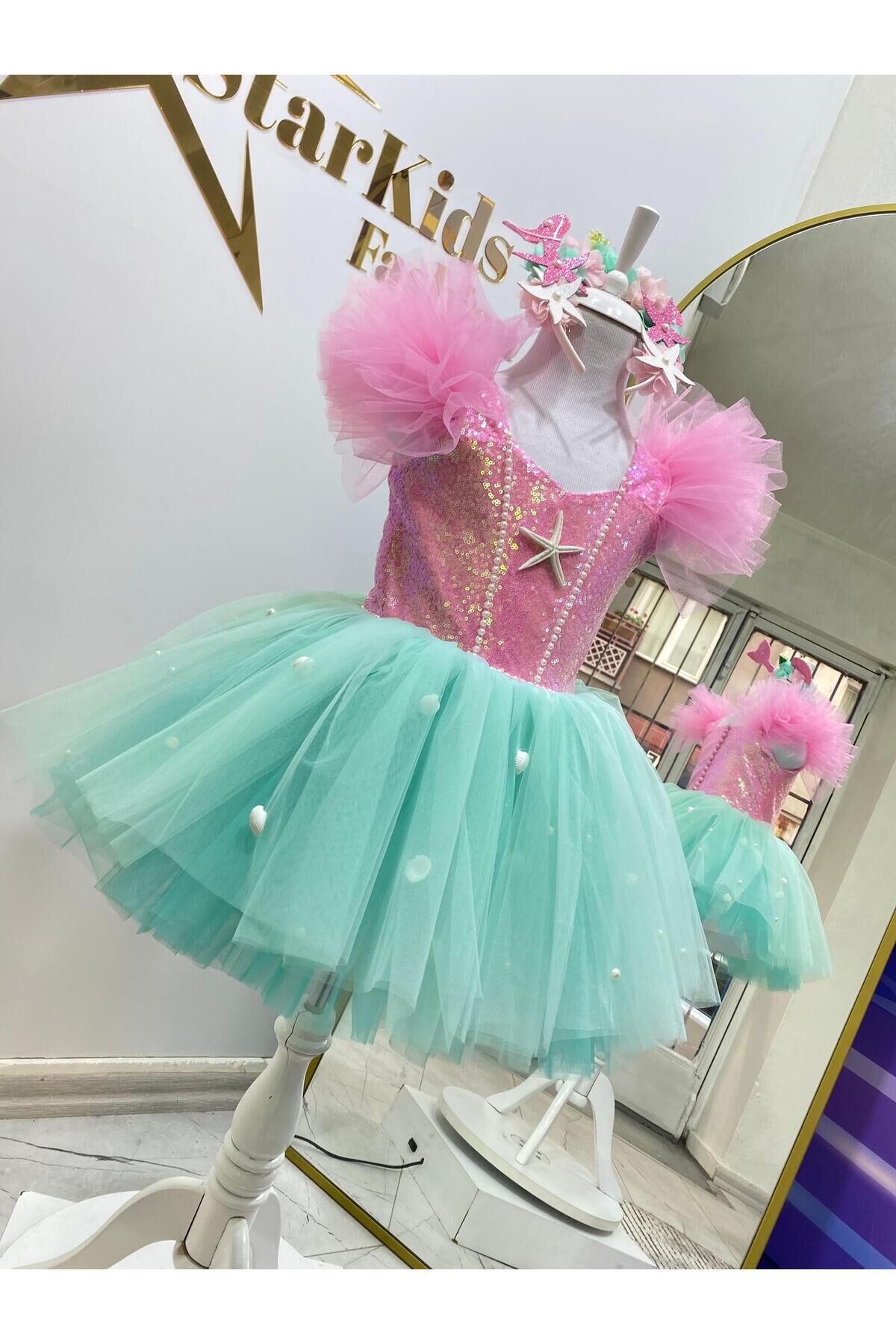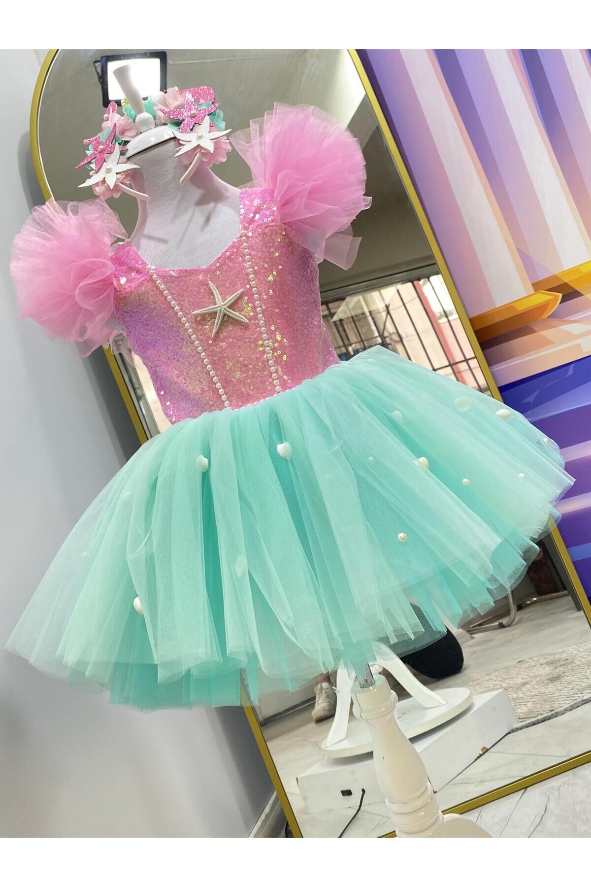 Elbisye Taç Dahildir - Kız çocukları için özel olarak tasarlanmış pembe deniz kızı kostümü, şıklığı ve neşeyi bir arada sunar.; - Tül kumaştan üretilmiş olan bu elbise, hafifliği ve zarafetiyle çocukların hareket özgürlüğünü kısıtlamaz.; - Astarlı yapısı sayesinde iç göstermez ve rahat bir kullanım sağlar.; - Cepsiz tasarımı ile modern ve minimalist bir görünüm sergiler.; - Payet detayları ile göz alıcı bir parlaklık kazandırırken, aynı zamanda geceleri parıldayan bir etki yaratır.; - İnce dokusuyla yaz aylarında bile serin tutarak konforlu bir deneyim sunar.; - Düğmeli kapama şekli pratik kullanım imkanı tanırken, kolayca giyip çıkarmayı mümkün kılar.; - Kutusuz olması sayesinde ekstra bir ambalaj maliyeti olmadan doğrudan satın alınabilir; böylece bütçeye dosttur.; - Kloş kalıp ile hareket ederken rahatlık hissi verir ve her adımında şık görünümünü korur.; - Üretim yeri Türkiye'dir; yerel malzemelerle üretilmiş olması gurur vericidir.; - Çocuklar için ideal yaş grubuna uygun olarak tasarlanmıştır; onların büyüme dönemlerinde de rahatlıkla giyebilmesini sağlar.; - Kalp yakası ile feminen çizgilere sahip olup, zarifliği ön plana çıkartır.; - Kolsuz tasarım sayesinde yaz aylarında serinlik hissi verirken aynı zamanda deniz kenarı aktivitelerinde de konfor sunar.; - Tül materyali hafifliğiyle dikkat çekerken, düz deseniyle sadeliği vurgular; herhangi bir aksesuarla kolayca kombinlenebilir.;