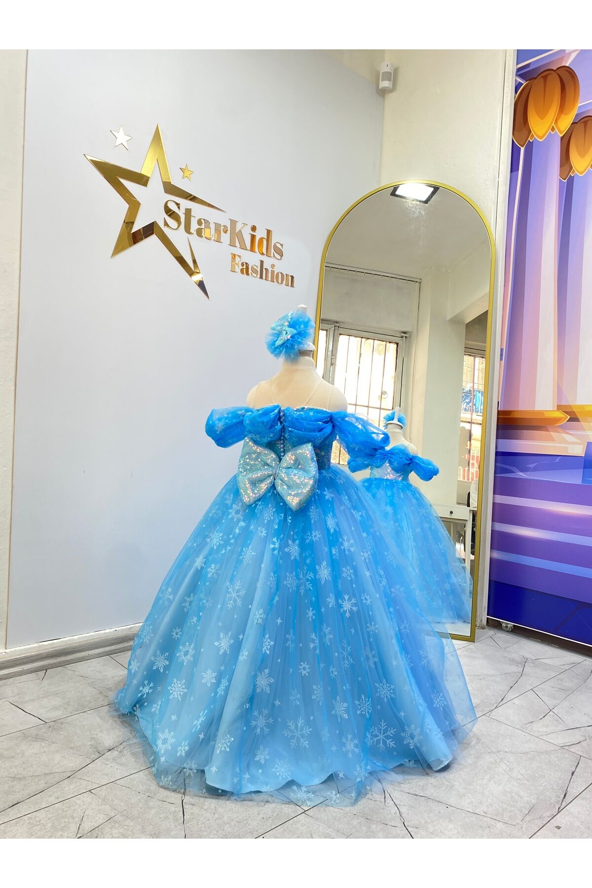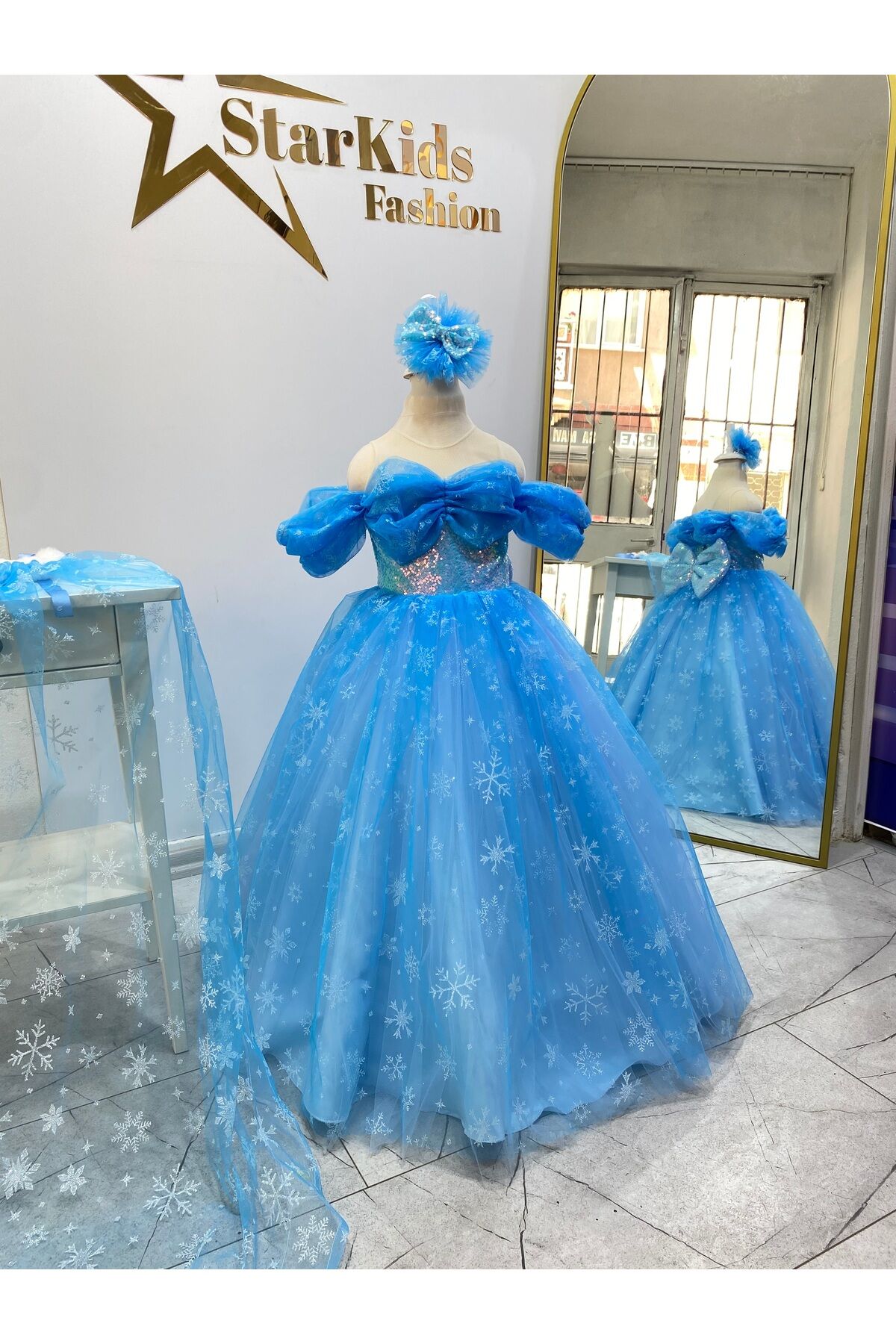 Karlar ülkesi elsadan ilham alan elbisemiz özel olarak tasarlanmıstır .; elbisenin yanında kasnak pelerin ve toka gönderılmektedir