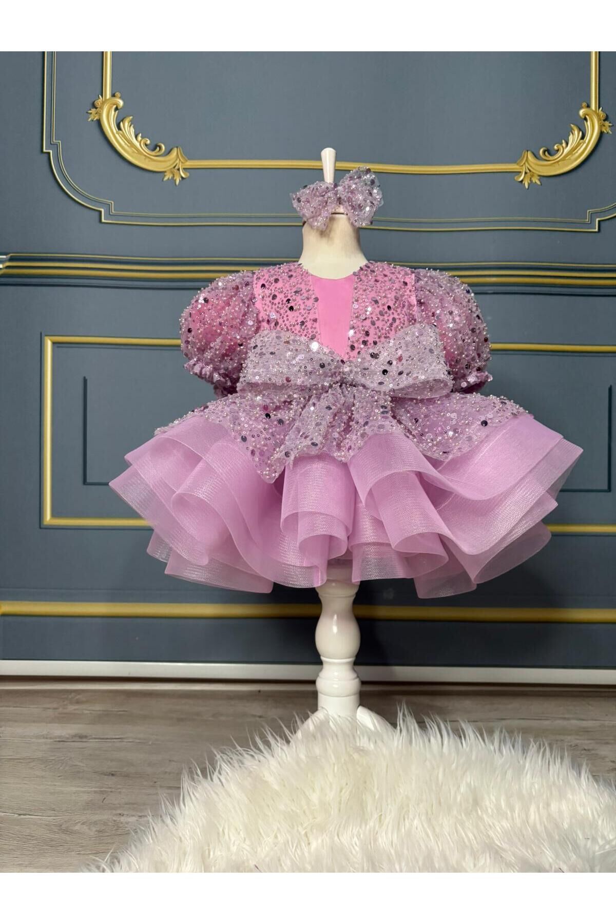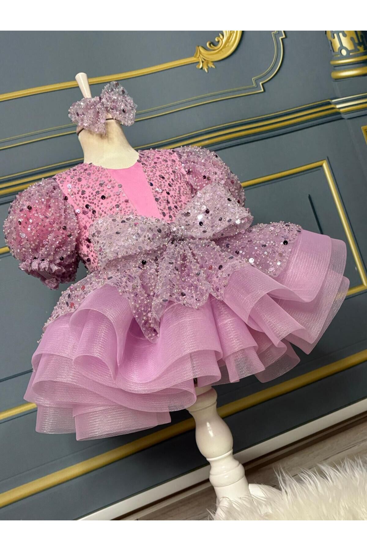 Hayal dünyasının kapılarını aralayın! Bu özel tasarım kısa pembe boncuklu elbise, miniklerin özel günlerinde prenses gibi hissetmelerini sağlar.