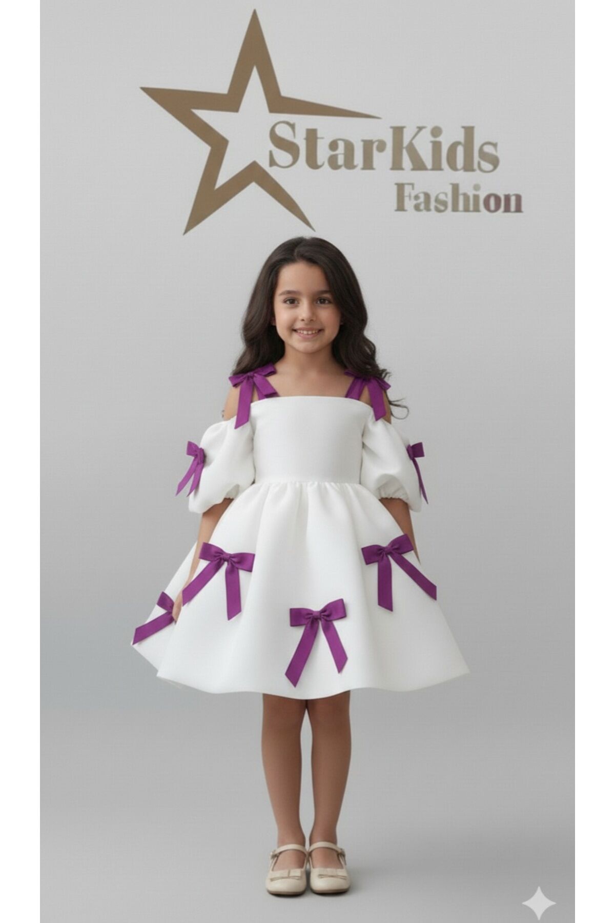 ✨ Zarafetiyle dikkat çeken mor fiyonklu kız çocuk elbisesi! Yumuşak kumaşı sayesinde gün boyu rahat, şık fiyonk detayıyla özel günler için ideal bir seçimdir.; Doğum günü, kutlama ve fotoğraf çekimleri için mükemmel bir modeldir.