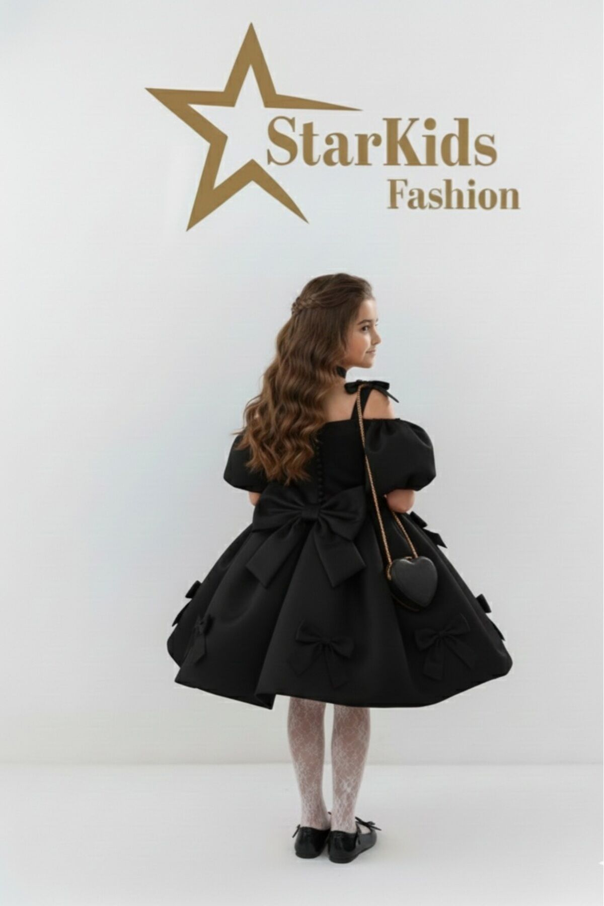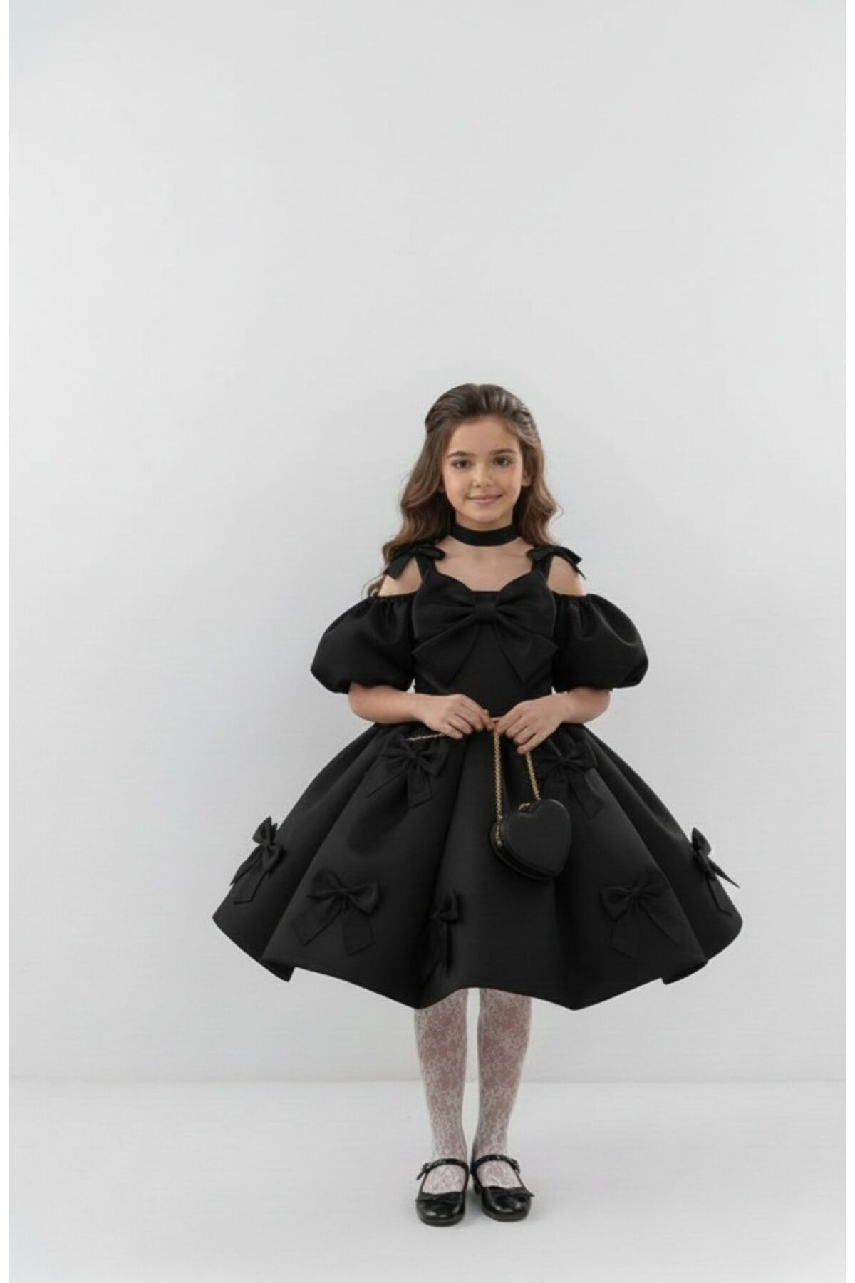 Zarif siyah rengi ve şık fiyonk detayıyla öne çıkan bu elbise, özel günler ve davetler için ideal bir seçimdir.; Rahat kalıbı sayesinde hareket özgürlüğü sunar.; Şıklığı ve konforu bir arada isteyen minikler için tasarlanmıştır.