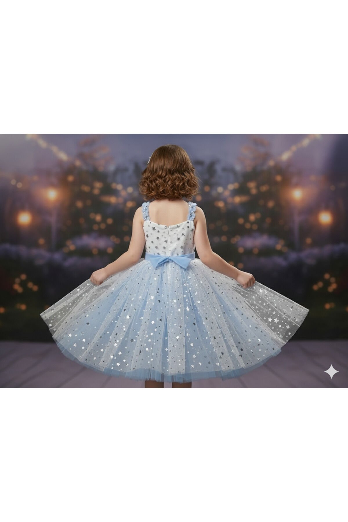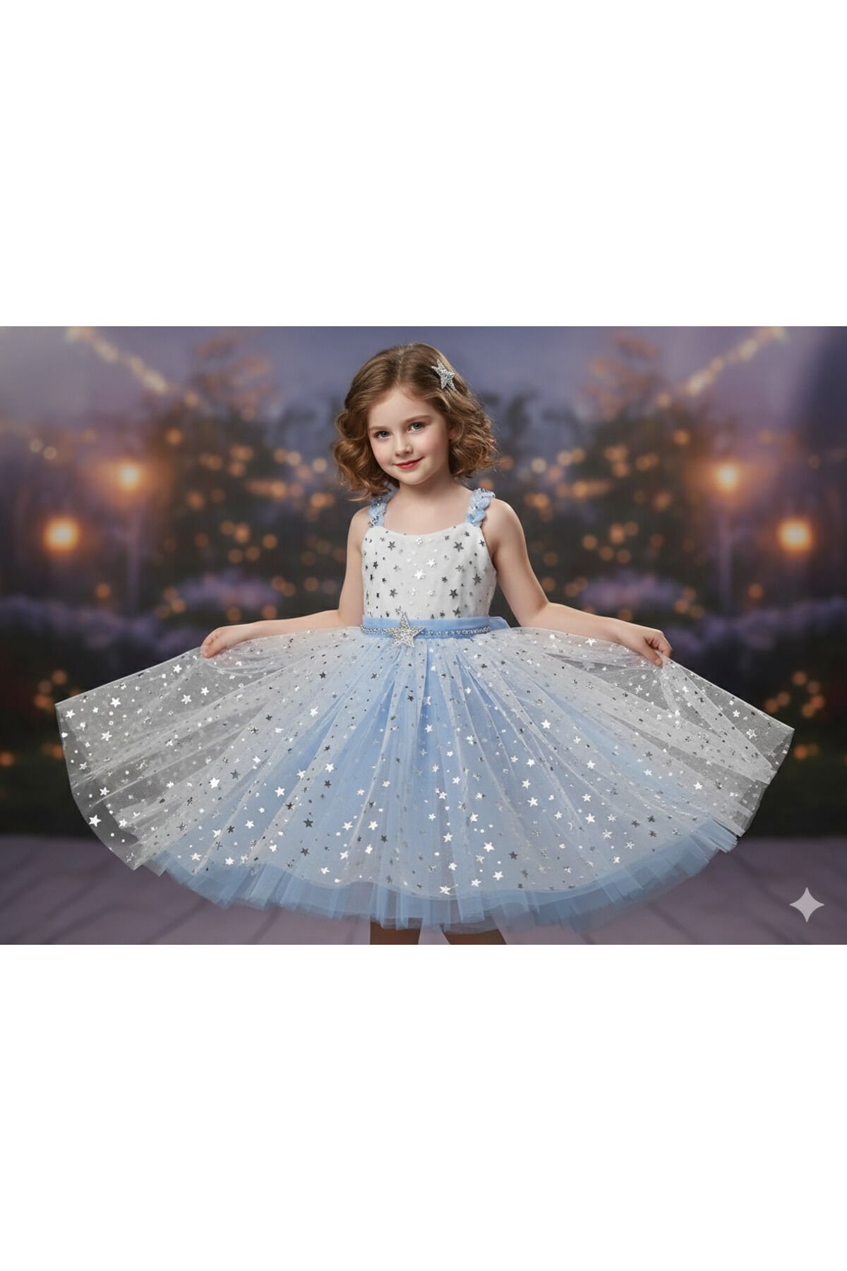 Yıldız desenli özel kumaştan üretilen kız çocuk elbisesi, şık ve rahat tasarımıyla miniklerin favorisi olacak.; Günlük kullanım ve özel günler için uygundur