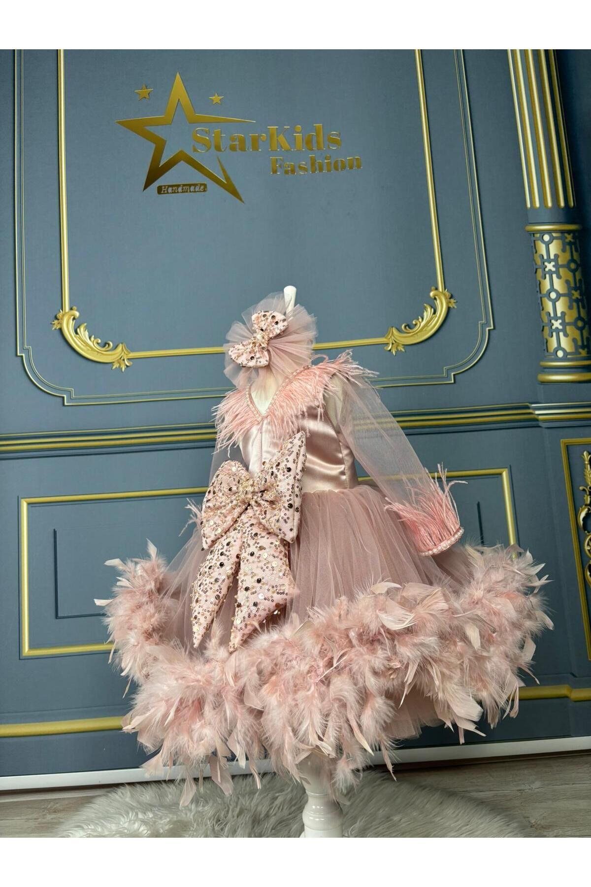 Pudra Rengi Uzun Kollu Tütü Elbise, Etekleri Otrişli Özel Tasarım Doğum Günü Elbisesi